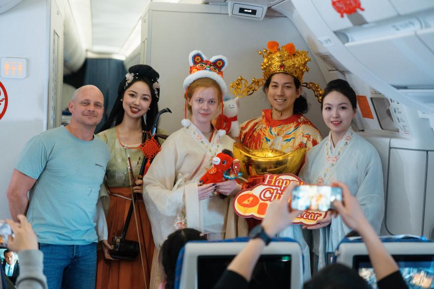 2月17日,南航CZ307航班上,一场融汇国风器乐、汉服雅韵与新春民俗的文化盛宴精彩上演。悠扬二胡、清越古筝穿越云端,经典旋律回荡客舱,中外旅客同赏国乐、共庆新春。客舱内福字迎春、年味浓郁,处处洋溢着喜庆祥和的节日氛围。