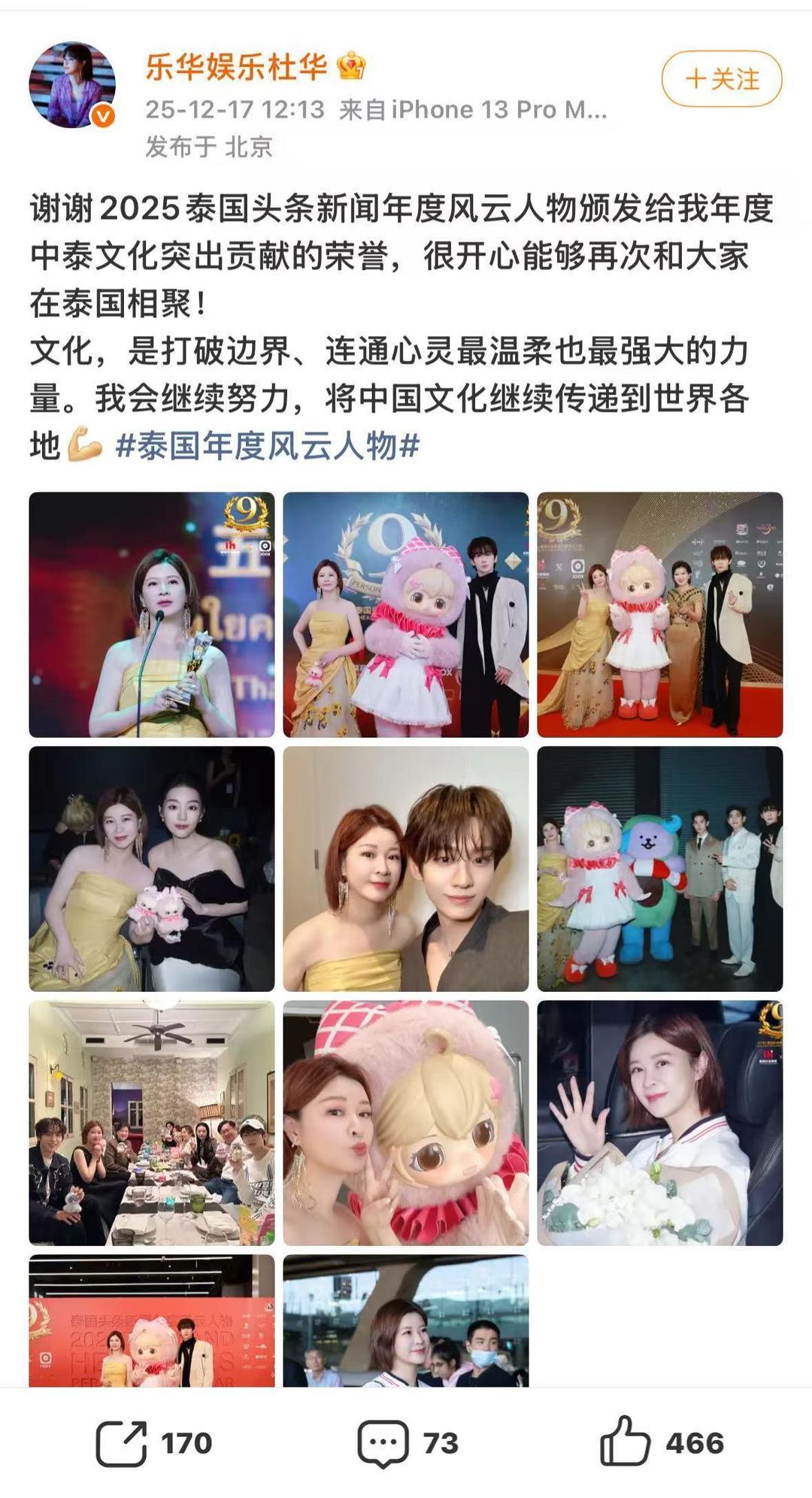 据了解,杜华此次在泰国出席了“2025泰国头条新闻年度风云人物颁奖典礼”,该典礼于12月16日在曼谷举行。12月17日,杜华发文感谢,称自己在该年度颁奖典礼上获得了“年度中泰文化突出贡献”的荣誉。