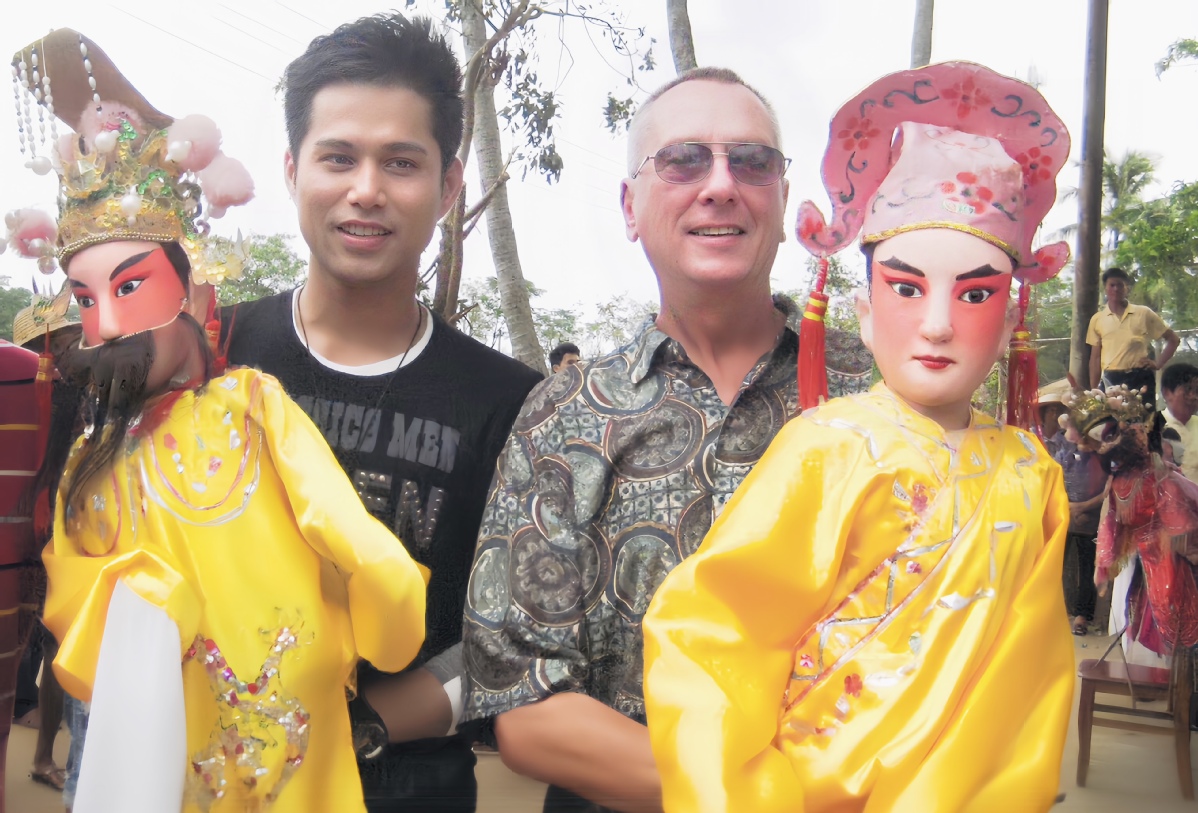 2011年10月,吉飞龙陪同奥斯卡评委、第61届奥斯卡最佳编剧奖得主巴瑞·莫罗在海南体验临高木偶戏。(资料图)